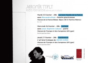 Le poète et performeur tchèque Jaromír Typlt est invité en France par l’Association Franco-Tchèque de Lyon pour une petite série de lectures et conférences. Nous nous étions rencontrés au Poezijos Festivalis Tarp de Vilnius, en 2012, sur lequel nous étions tous deux invités. J’ai aussi eu le plaisir de traduire, en compagnie de Denis Molcanov, 3 de ses textes pour la revue de poésie Bacchanales en 2013. Jaromír Typlt est adepte de lectures très performatives, incluant souvent effets sonores, vidéos ou projections 3D – Il est en outre spécialiste de l’Art Brut tchèque et a publié plusieurs livres et monographies d’artistes sur le sujet.